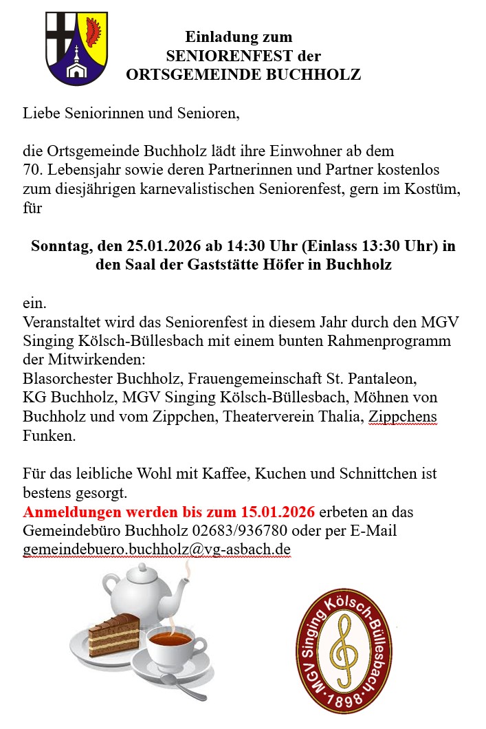 Hier sehen Sie aktuelle Veranstaltungen innerhalb der Ortsgemeinde Buchholz. Eine Jahresübersicht finden Sie im Menüpunkt KULTUR UND FREIZEIT unter 'Veranstaltungen'. Zudem finden im Heimathaus Vorträge und Veranstaltungen statt. Schauen Sie einfach mal rein!